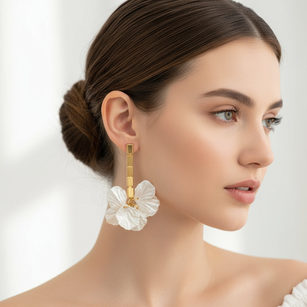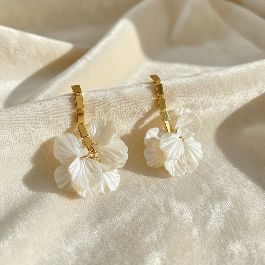 Aurora Drops showcase delicate white petals that add a refined grace to your ensemble. Expertly crafted with an anti-tarnish finish, these drop earrings offer enduring shine and elegance.