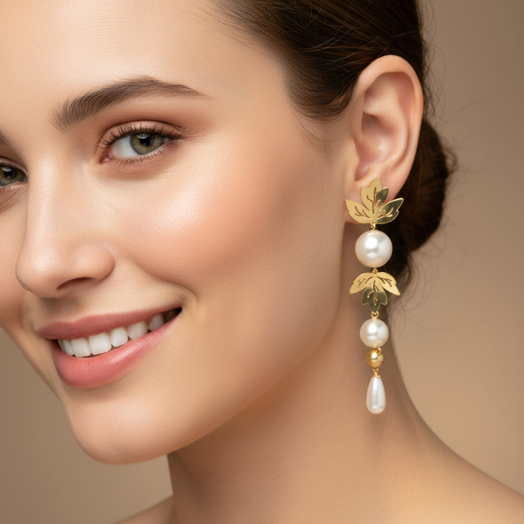 Elevate your look with Leaf Light Danglers, featuring a beautifully crafted anti-tarnish leaf design adorned with delicate pearls. These lightweight earrings offer enduring shine and comfort, making them an impeccable choice for special occasions where elegance meets effortless style.